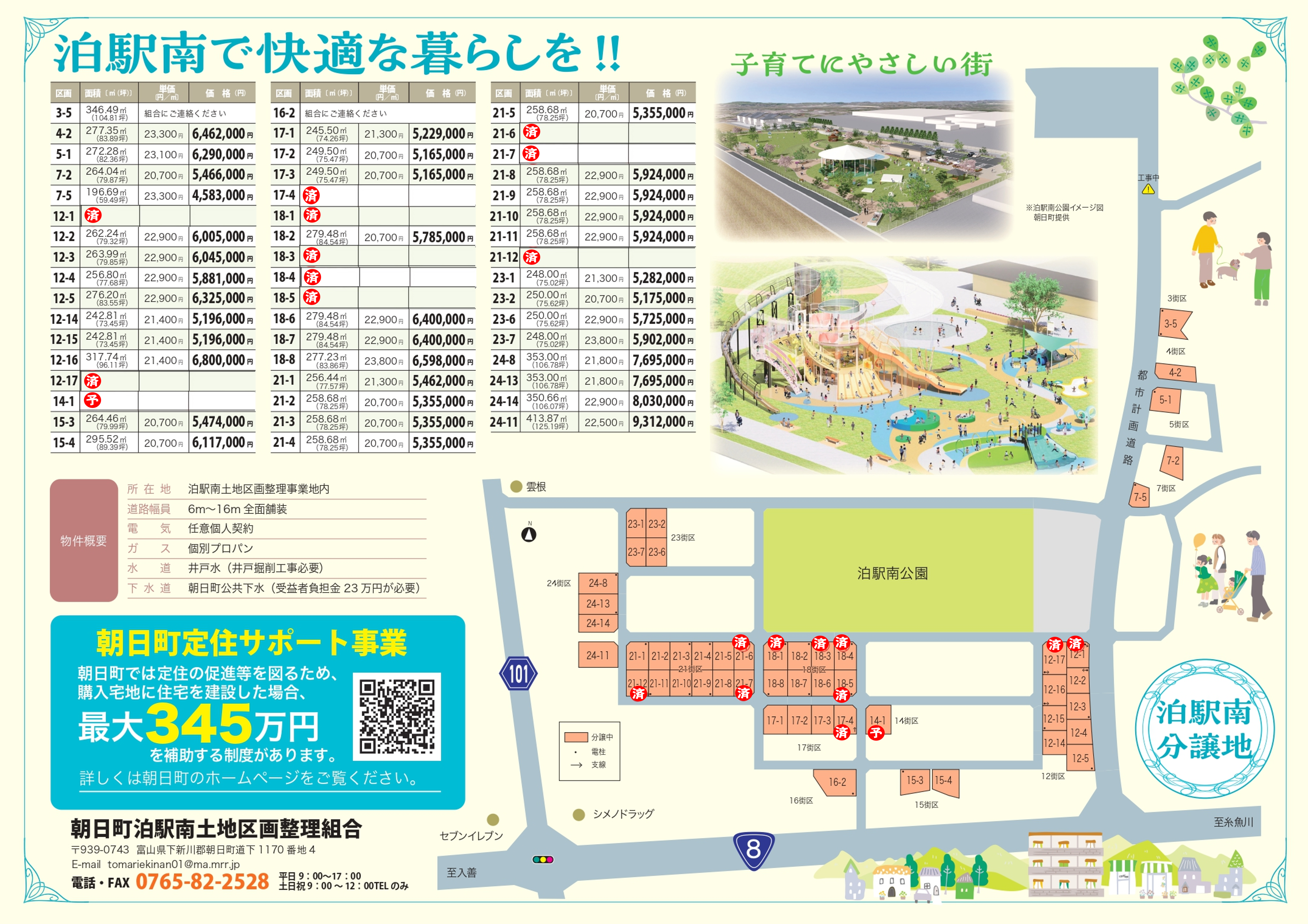※定住サポート事業※(表中の価格は、定住サポート事業適用前の価格です。) 定住の促進等を図るため、購入宅地に住宅を建設した場合、最大345万円を補助する制度を朝日町で行っているサポートです。 詳しくは朝日町のホームページをご覧ください。
